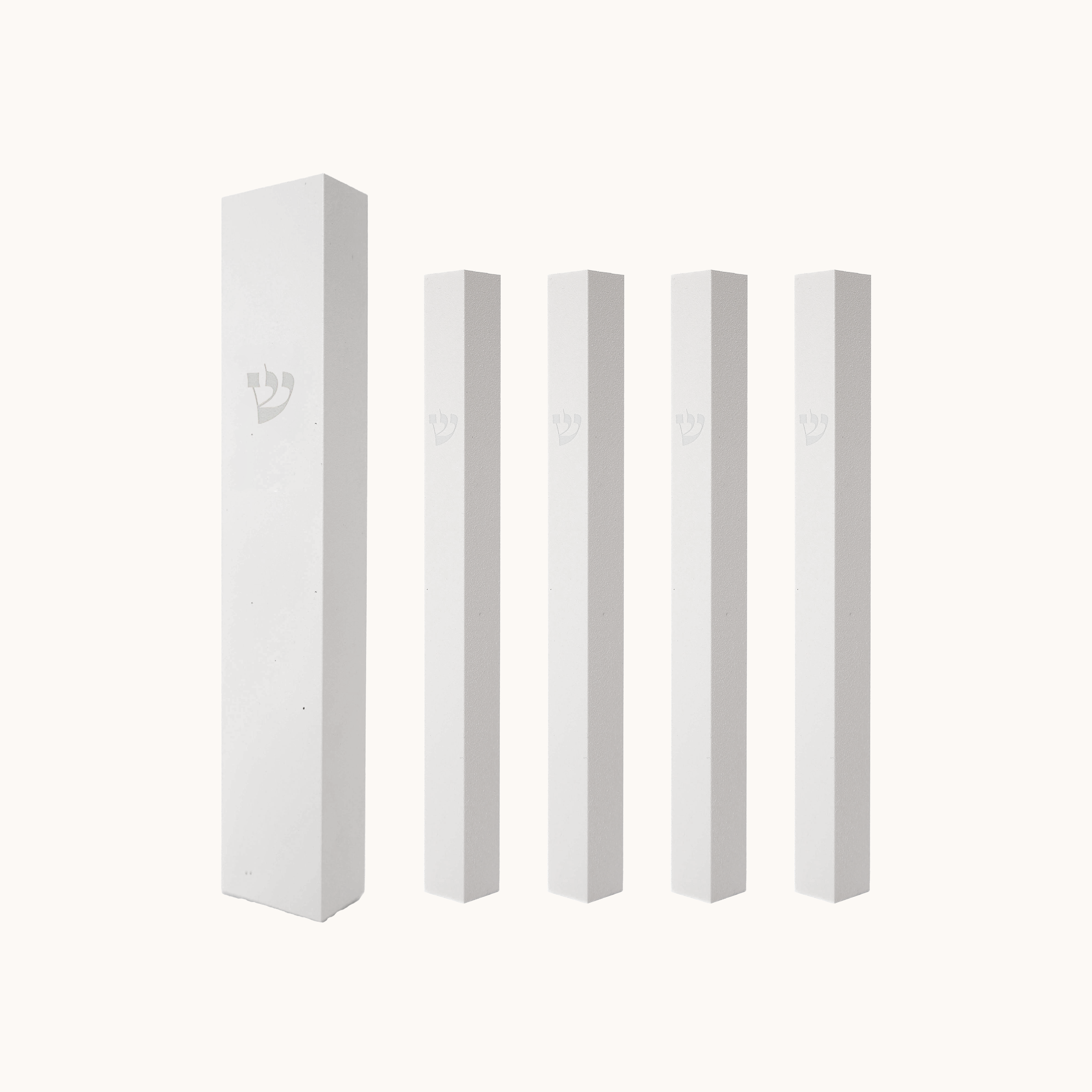 ערכה של בתי מזוזות מושלמת למשקוף הכניסה לבית בעיצוב מינימליסטי ועדין בצבע לבן שלג עם חריטה עדינה של האות ש .